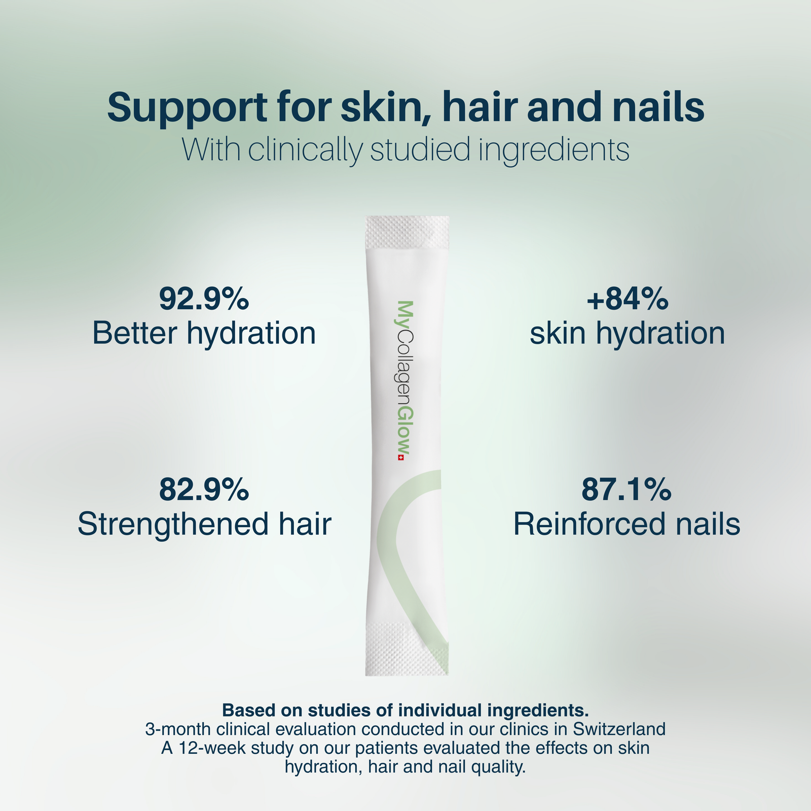 3-month clinical evaluation conducted in our clinics in Switzerland. A 12-week study on our patients evaluated the effects on skin hydration, hair and nail quality.