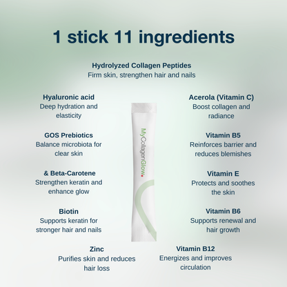 Composed of 11 active ingredients working in synergy, the MyCollagenGlow formula supports the biological mechanisms involved in functional hydration, balancing the skin and scalp microbiome, and preserving and strengthening nail integrity.